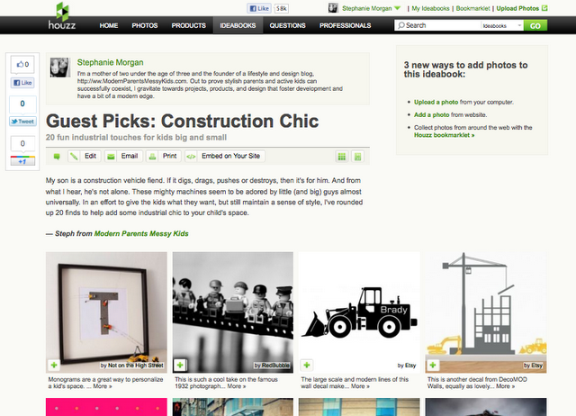 And remember last month when I said I wanted to explore a little more of the “modern parents” half of MPMK? I’m pleased to announce that I’ve signed on as a new monthly contributor to houzz, an absolutely amazing site for home design enthusiasts. With over 200,000 high quality images of design products and inspiration, this is a site I can seriously lose myself in for hours at a time. Check out my inaugural idea book, “Construction Chic: 20 Fun Industrial Touches for Kids Big and Small”. You’ll now be able to find a link to all my ideabooks at the bottom of my right side column.